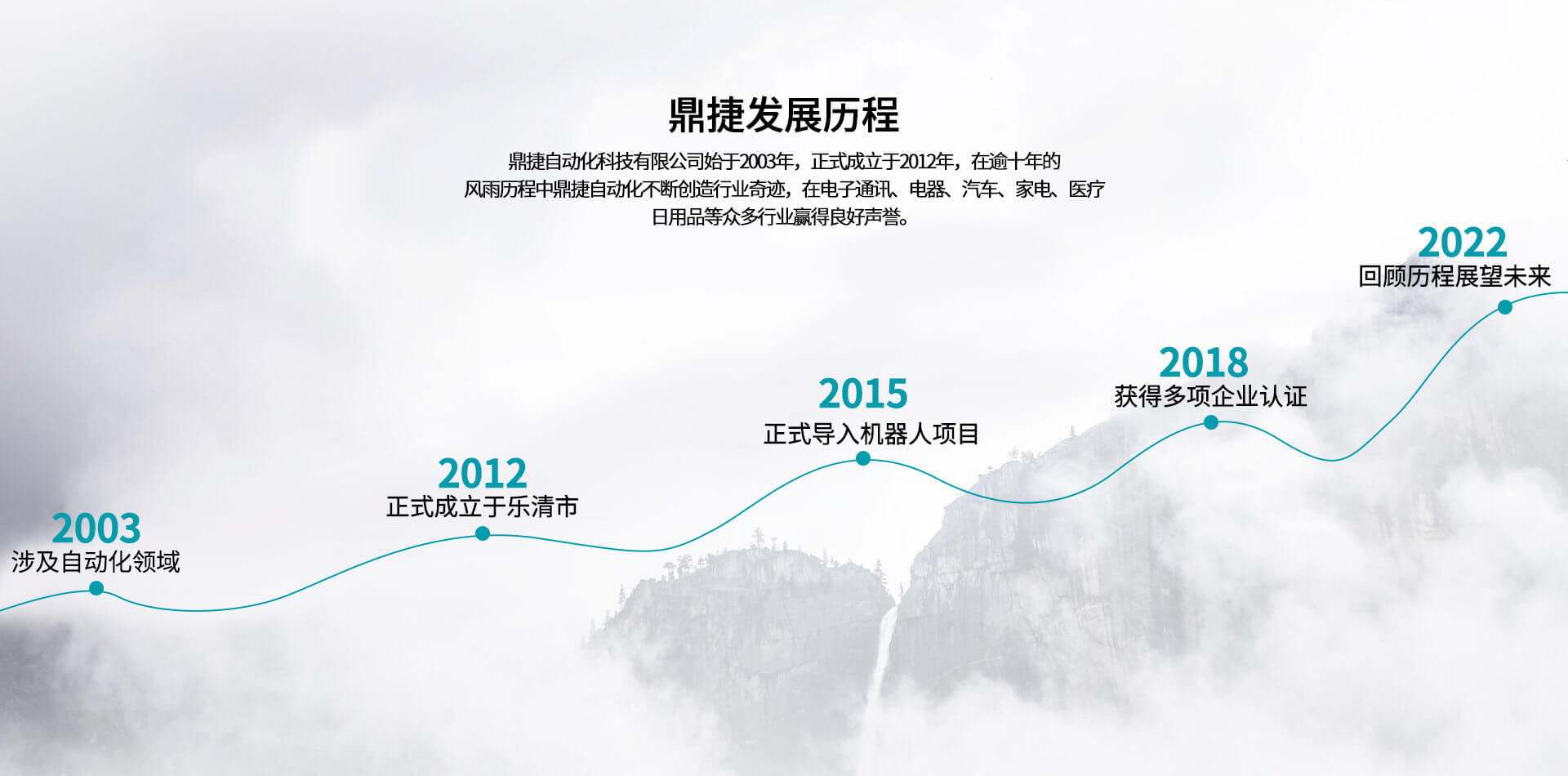 公司始于2012年,在逾十年的風雨歷程中,不斷創(chuàng)造行業(yè)奇跡,在電子通訊、電器、汽車、家電、醫(yī)療、日用品等眾多行業(yè)贏得良好聲譽。公司坐落于浙江省樂清經(jīng)濟開發(fā)區(qū),現(xiàn)有人員63人,擁有經(jīng)驗豐富的工程技術研發(fā)團隊11人,其中高級工程6人,具備本科以上學歷高級工程人員比例78%;同時鼎捷自動化在蘇州,東莞等地設立分公司以服務目標市場客戶,目前鼎捷自動化已經(jīng)為下客戶提供配套自動化解決方案:泰科、安費諾、莫士、華為、中興、普聯(lián)、智英、意華、德豐、公牛、萬事達、華豐、飛雕、普思、冠聯(lián)、俊朗松田、進聯(lián)、高正、盛凌等。鼎捷自動化專業(yè)從事連接器、開關及相關電子、電器、五金、塑膠產(chǎn)品組裝自動化定制、設計、制造、銷售。2012年,鼎捷自動化正式導入機器人應用項目,可為各類客戶提供電子、電器、汽車、五金、塑膠等集成自動化智能組裝系統(tǒng)。